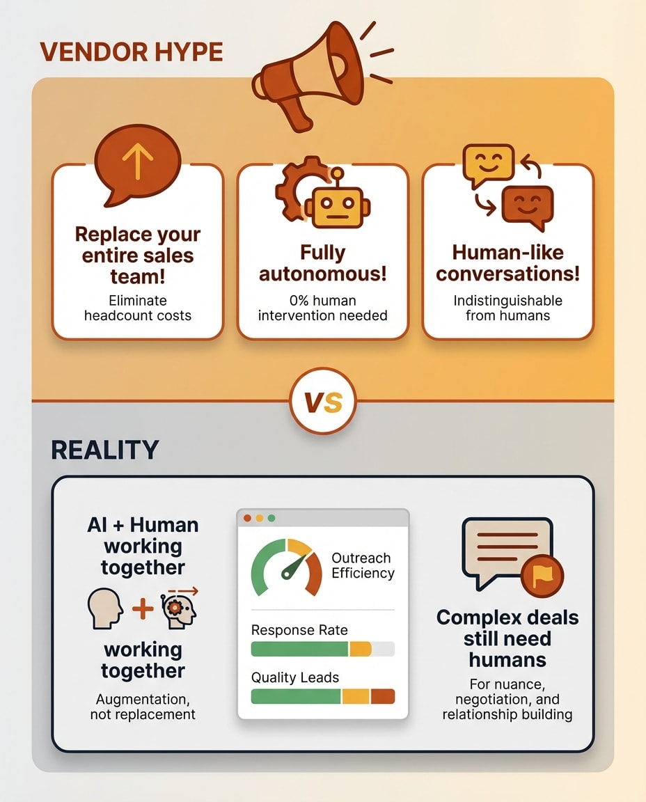 "Replace your SDR team." In practice, AI SDRs augment human teams. They handle volume and routine. Humans handle relationships and complexity. The companies reporting the highest ROI from AI SDRs are using hybrid setups, not full replacement.