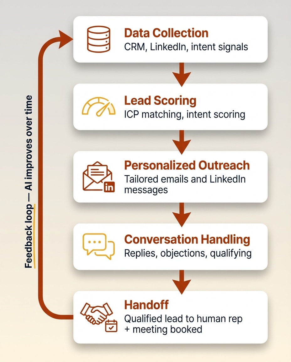 You'll also see these tools called "AI sales agents," "virtual SDRs," or "AI BDRs" (business development representatives). The terminology is inconsistent across the industry, but they all describe the same core concept: software that automates the early stages of the sales pipeline.