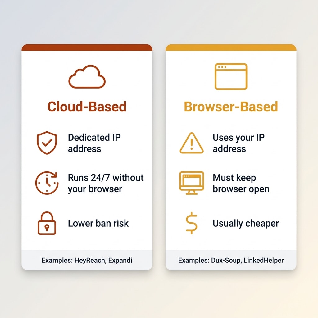 Cloud-based tools run on remote servers. They connect to LinkedIn through dedicated IP addresses and operate independently of your browser. Because they do not inject code into LinkedIn's front end, they are harder to detect. The tradeoff is that you are giving a third-party service access to your LinkedIn credentials.