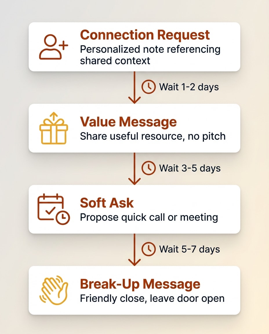 First follow-up (Day 2-3 after acceptance): Deliver value. Do not pitch.